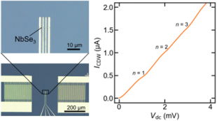 (左)圧電基板LiNbO3上に転写されたNbSe3細線と、NbSe3細線に表面弾性波を照射するための櫛型電極の光学顕微鏡像。(右) CDW電流ICDWと印加した直流電圧Vdcの関係。測定は電荷密度波転移温度以下の45 Kで行われた。ICDWに量子化に伴うプラトー構造(n = 1, 2, 3)が観測された。