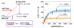 (a) トリウム229準位図(関係する基底状態及び励起状態)。(b) X線照射時間に対する生成アイソマー数の増加の測定データ。室温(36℃)と低温(-120℃)の比較。
