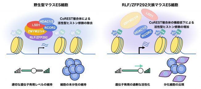 左: 野生型では、RLF/ZFP292によりCoREST複合体が適度に働き、活性型ヒストン修飾が除去されることで分化に不可欠な遺伝子の過剰な発現が抑えられる。右: RLF/ZFP292欠損では、CoREST複合体の機能が低下し、活性型ヒストン修飾が増加して分化に関わる遺伝子の発現が上昇する。その結果、細胞の未分化性が維持できず、分化が進む。